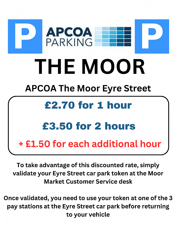 The closest car parks to the Moor Market is currently Eyre Street car park (known locally as the Kit Kat)